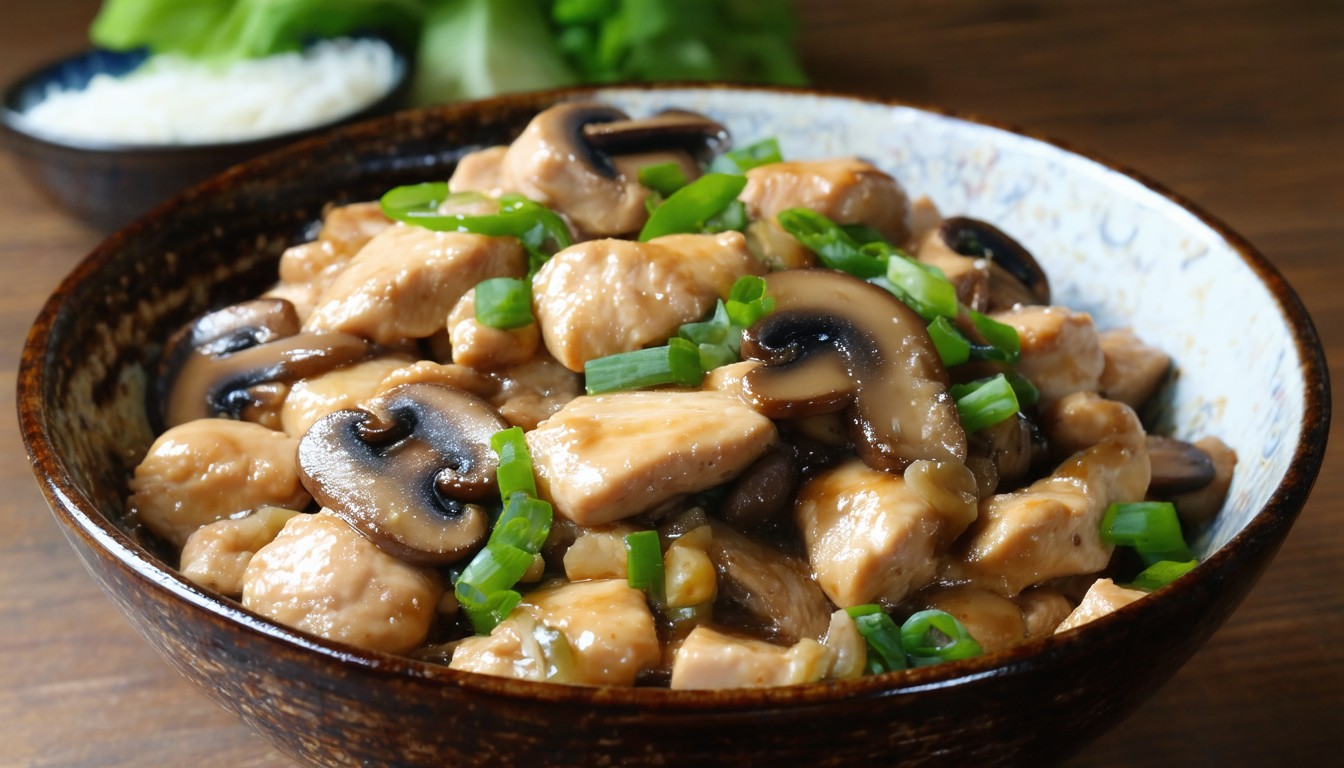 The name comes from Cantonese, translating directly as “mushroom chicken slices.” It describes the dish’s primary ingredients—mushrooms and thinly sliced chicken breast.